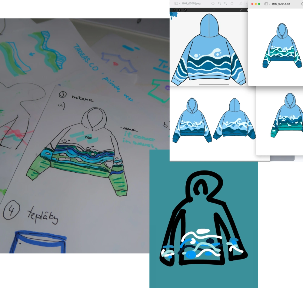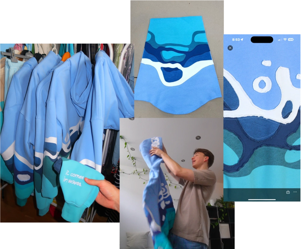 V říjnu 2023 jsem přišel s nápadem na Wave Hoodie. První nákres jsem udělal na insta stories. Hlavou mi hned proběhla myšlenka "it comes in waves", protože všechno v životě přichází ve vlnách.. Když byl na konci roku design dokončený, přišla ještě větší výzva.. Jak design přetvořit do reálného produktu.