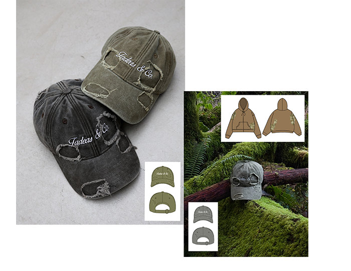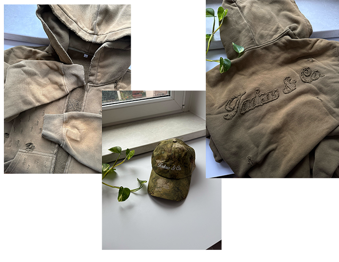 Posledním produktem (který prožil výběrové řízení, jelikož jsem jich spoustu vyrobil - jednu zip-up mikinu vidíte na fotce) byly kšiltovky. Moje první klasické bestsellery! Chtěl jsem zkombinovat “Grounded zemský vibe” společně se streetwearovým stylem a potrhané kšiltovky, které doplní každý outfit byly na světě. Baví mě to psací logo v kombinaci s potrháním kšiltovky.