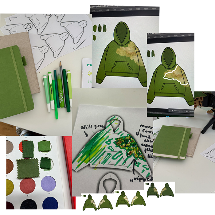První nápad, který jsem dostal, přinesl Grounded hoodie. Chtěl jsem udělat svůj vlastní twist na realtree/camo vzor, nechal jsem se inspirovat mechem a jehličím v lese + všemi zemními tóny. Po několika měsících jsme s grafičkou konečně doladili Grounded vzor, přesný tvar “roztržení” na mikině a tu perfektní zelenou barvu.