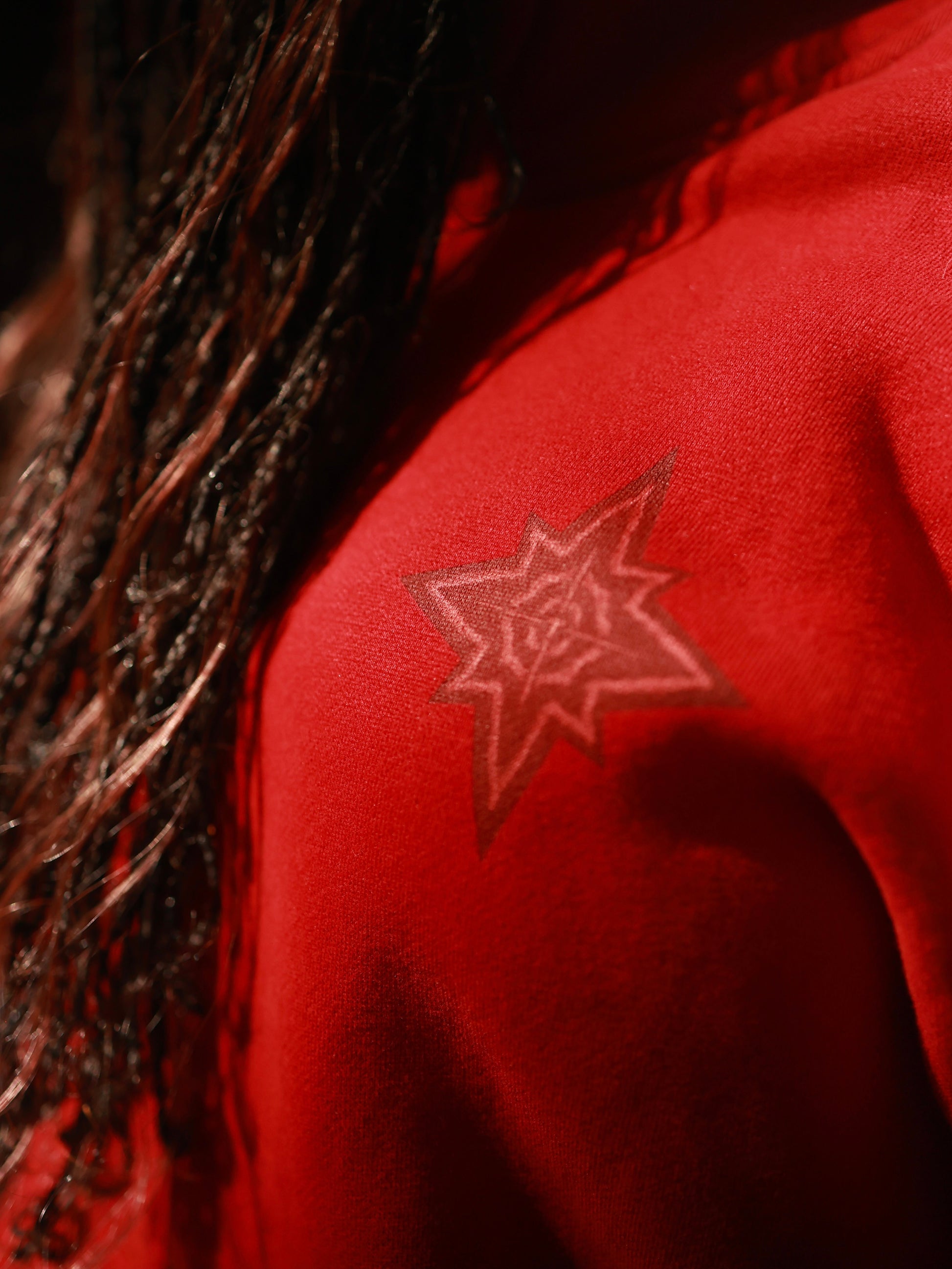 • Červené hvězdy po celé mikině (skrytý logo detail na hrudi)